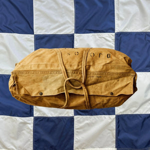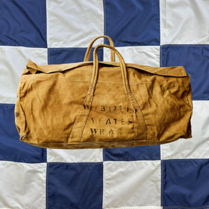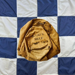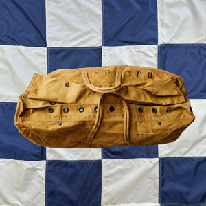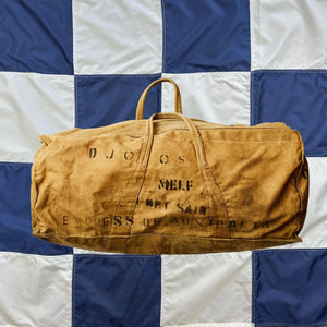 A 1940s British RAF carryall, named to Yeates, a member of the Women's Royal Army Corps. Multiple stencils suggest Ms Yeates served with British Middle East Land Forces (MELF) based out of Port Said in Egypt, and arrived there on the British troop carrier ship EMS Empress of Australia.